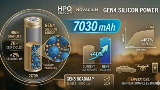 HPQ Silicon社とそのパートナーであるNovacium社は、最新の「GEN4」シリコン系負極材料を用いた21700型円筒形電池において、7030mAhという驚異的な放電容量を記録したと発表しました。これは、現在市場に流通している一般...