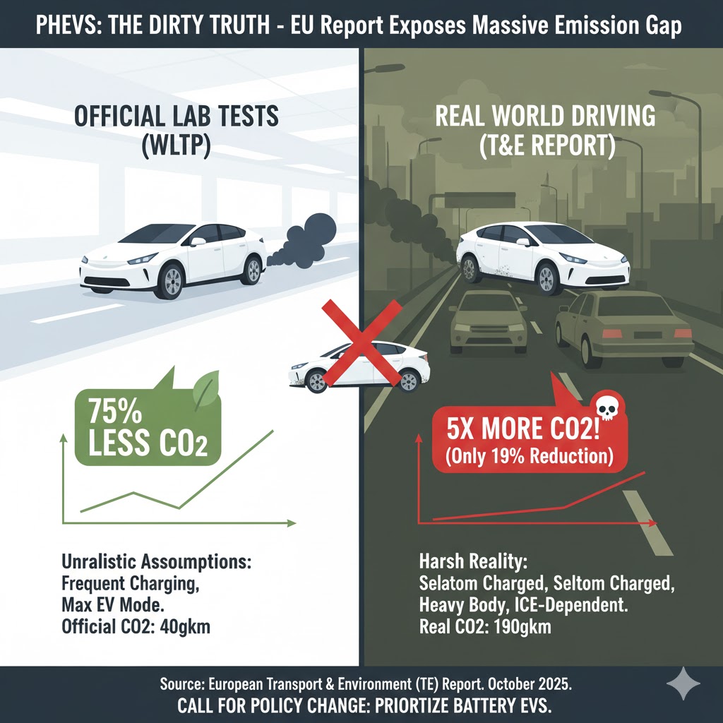 プラグインハイブリッド車(PHEV)に関する欧州運輸環境連盟(T&E)の報告書は、PHEVが従来のガソリン車とほぼ同程度の二酸化炭素(CO₂)を排出しており、公式の環境性能評価と実際の運転状況との間に深刻な乖離があることを指摘しています。