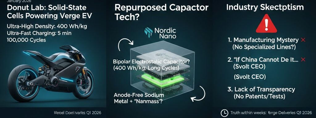 - Repurposed Supercapacitors? Nordic Nano’s “Bipolar Electrostatic Capacitor” matches Donut Lab’s 400 Wh/kg and long-cycle claims perfectly. While capacitors typically struggle with energy density, the company claims to have shattered this barrier using nanotechnology.
