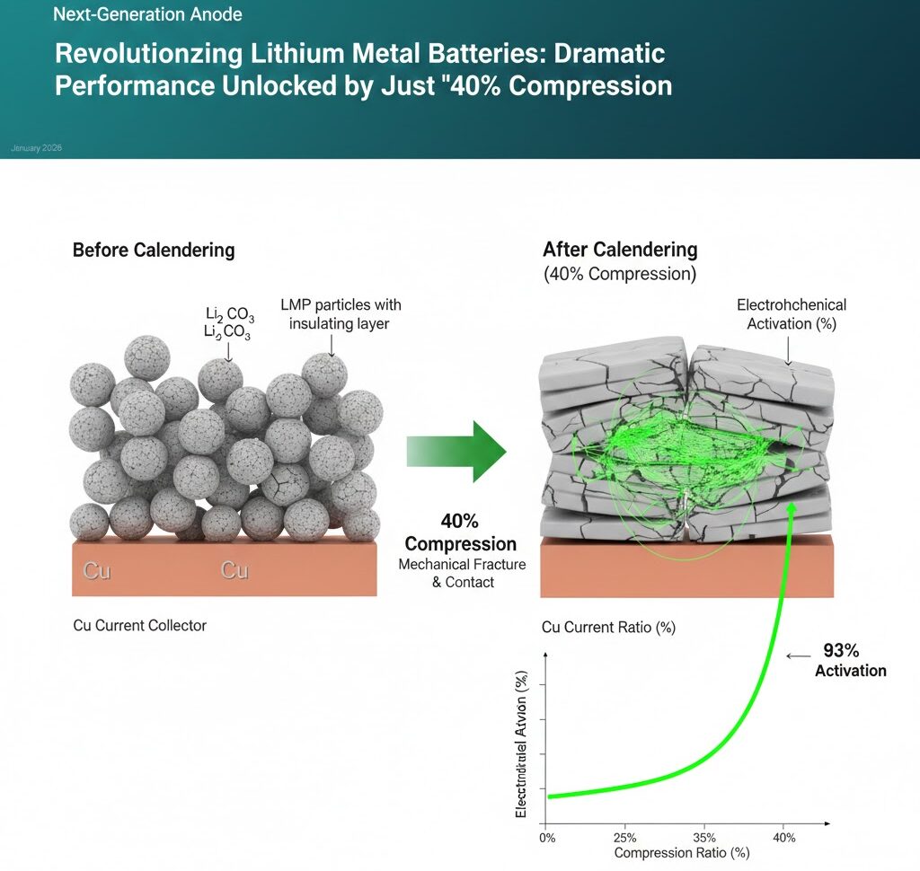 The electrochemical activation of LMP electrodes depends entirely on the “mechanical fracture and contact” facilitated by calendering. By identifying the optimal calendering ratio of 40%, a clear path has been established for the high-quality, low-cost mass production of next-generation lithium metal batteries.