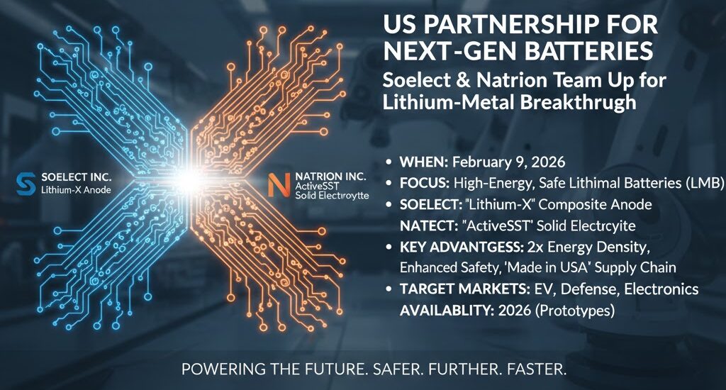 On February 9, 2026, North Carolina-based Soelect Inc. and New York-based Natrion Inc. announced a Strategic Memorandum of Understanding (MOU) for the development and manufacturing of next-generation lithium-metal batteries (LMB).