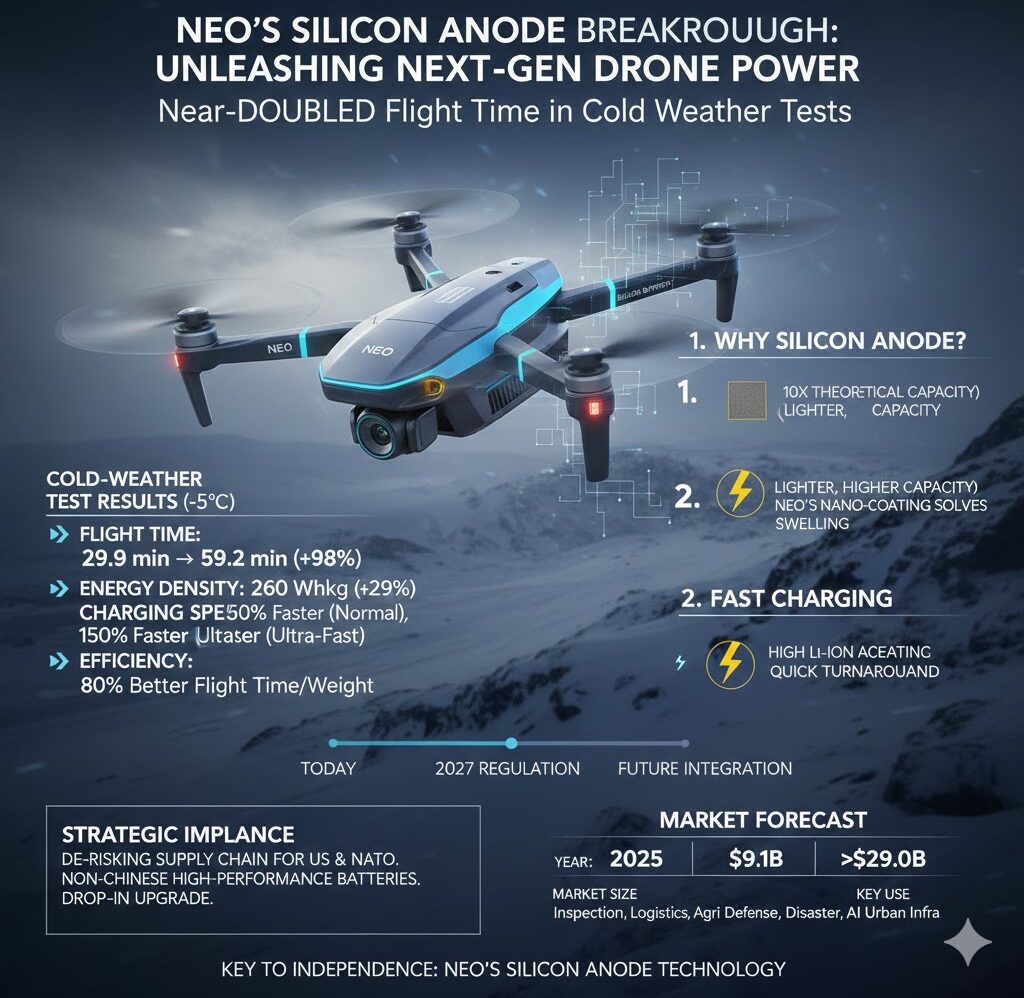 NEO Battery Materials Ltd. has developed a new battery utilizing proprietary silicon anode technology. In real-world flight tests, it recorded performance that far exceeded standard Chinese-made battery benchmarks.