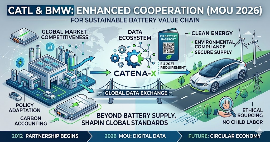On February 25, 2026, CATL, the world’s largest automotive battery manufacturer, and the BMW Group signed a Memorandum of Understanding (MOU) in Beijing to enhance their cooperation. This agreement, signed during German Chancellor Friedrich Merz’s visit to China, expands the partnership beyond a product-supply framework to include digital data management and regulatory policy alignment.