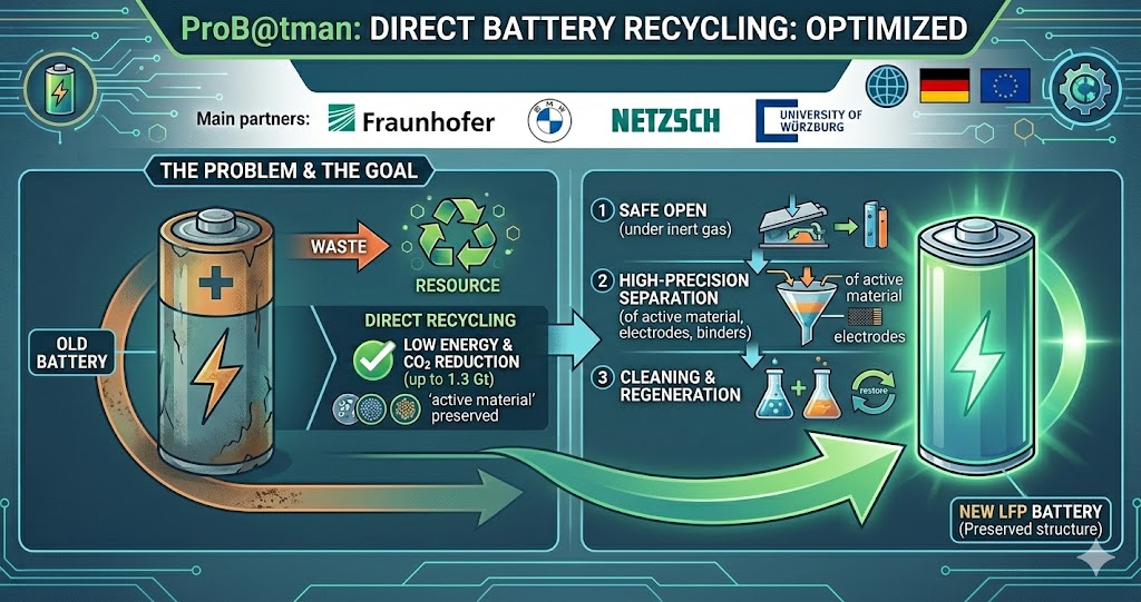 On February 23, 2026, an industry-academic consortium led by the Fraunhofer Research Institution for Battery Cell Production (FZEB), and including BMW, Netzsch, and the University of Wurzburg, launched “ProB@tman.” This collaborative project aims to optimize “direct recycling” technologies for lithium-ion batteries.