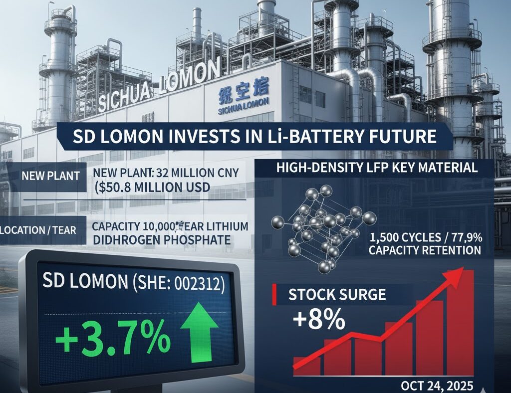 中国のリン酸鉱山会社兼肥料メーカーである**SDロモン(Sichuan Lomon)は、新たなリチウム電池原料工場の建設に3億6,200万人民元(約5,080万米ドル)**を投資する計画を発表し、これを受けて2025年10月24日の株価が上昇しました。