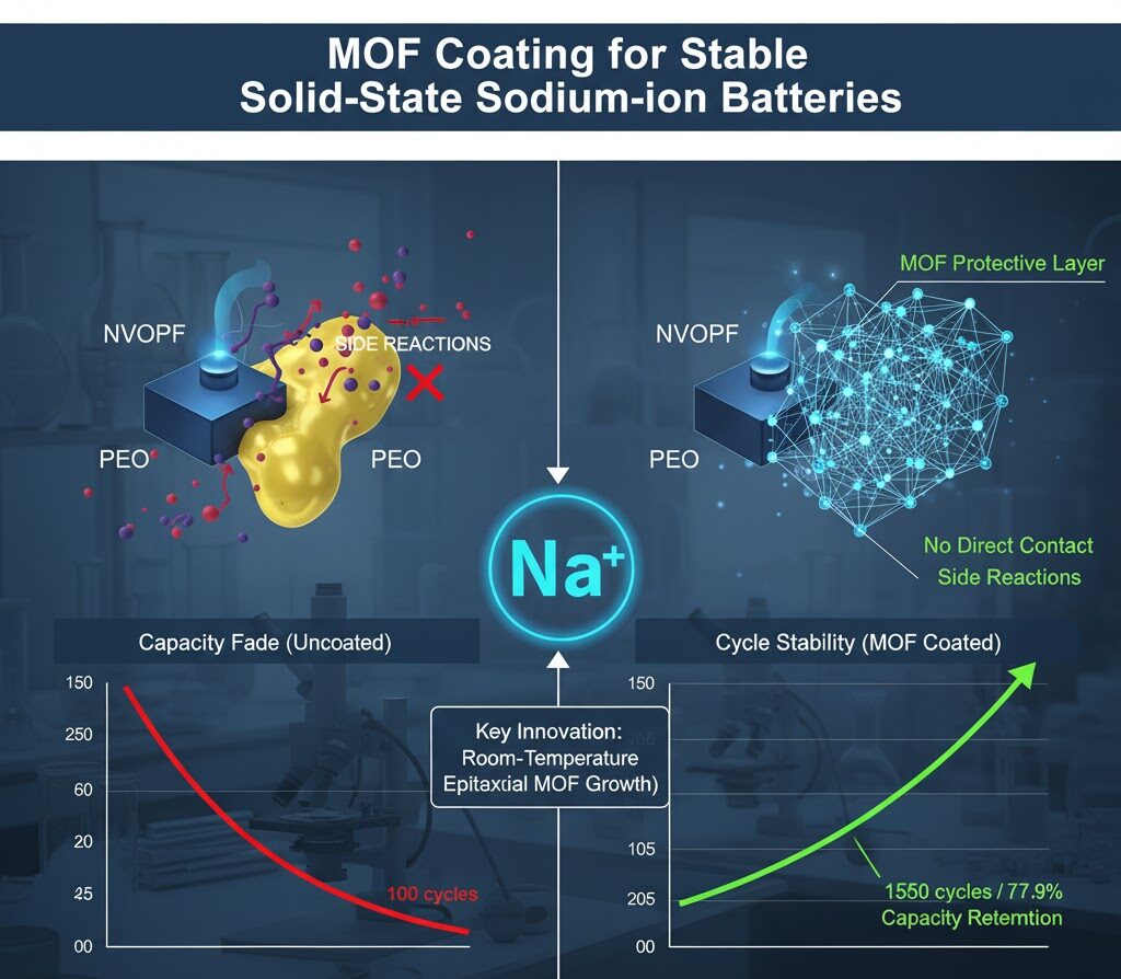 研究チームは、正極材料であるNVOPF(リン酸バナジウムフッ化物ナトリウム)の表面に、室温等方性エピタキシャル成長法を用いて均一で高密度なMOF層を成長させました。この緻密なMOF層が、正極と固体電解質(PEO)との直接接触を防ぐ「保護バリア」として機能し、副反応を大幅に最小限に抑えることに成功しました。