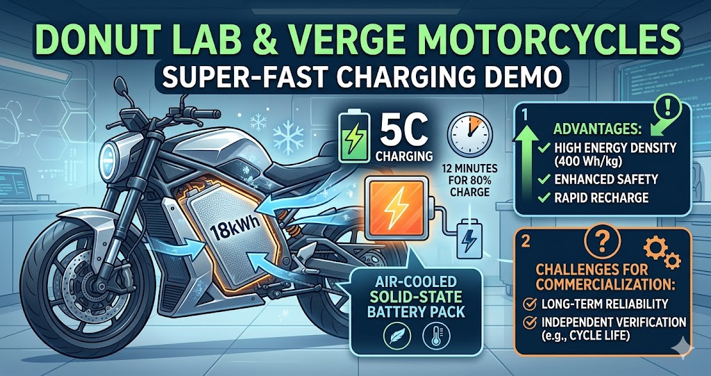 Finland-based Donut Lab, in collaboration with Verge Motorcycles, has conducted a high-speed charging demonstration using an 18kWh solid-state battery pack integrated into a real motorcycle chassis. The test demonstrated 5C charging, reaching an 80% charge in just 12 minutes.