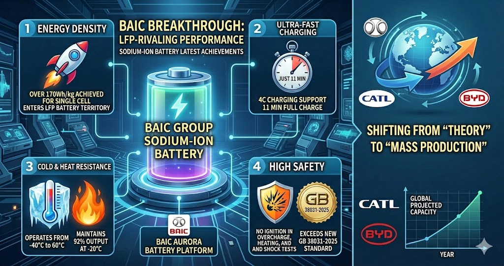 As the Electric Vehicle (EV) industry grapples with lithium price volatility and supply chain constraints, BAIC Group, a major Chinese automaker, has sent shockwaves through the sector with its latest breakthrough in sodium-ion battery technology. Long hindered by low energy density, sodium-ion batteries have reached a turning point: BAIC’s new prototype matches the performance of widely used Lithium Iron Phosphate (LFP) batteries. The commercialization race—already crowded with giants like CATL and BYD—has now officially shifted from “theoretical” to the “mass production” phase.