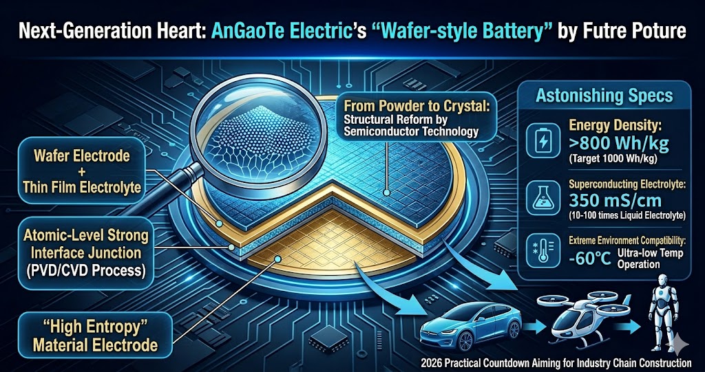 Amidst this backdrop, 2026 has been designated by China’s Ministry of Industry and Information Technology (MIIT) as a pivotal year for establishing the all-solid-state battery industrial chain. Responding to this call, one startup is standing out: AnGaoTe Electric. Founded in late 2022, they advocate an approach that defies conventional battery manufacturing wisdom by “developing batteries with a semiconductor mindset.” The countdown has officially begun for the commercialization of their “wafer-style battery,” which eyes a staggering energy density of 1000Wh/kg.