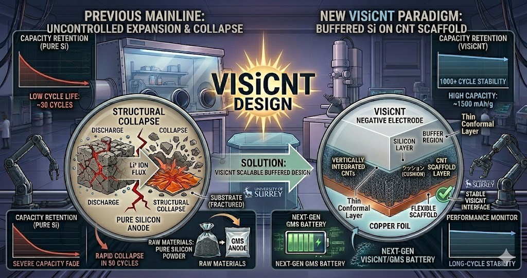 However, silicon has a fatal weakness: it expands and contracts violently during charging and discharging, leading to structural collapse. The “VISiCNT” design, announced by a research team at the University of Surrey (UK), overcomes this challenge by using carbon nanotubes as a “flexible scaffold,” achieving ultra-high capacity near theoretical limits.
