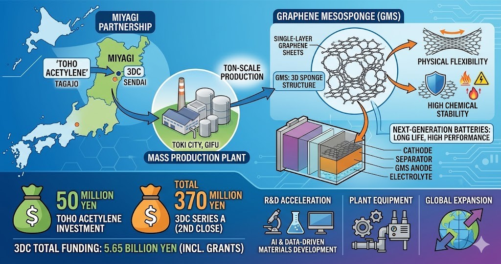 両社はともに宮城県に拠点を置く企業(東邦アセチレン:多賀城市、3DC:仙台市)であり、地域的なつながりを基盤に次世代電池材料の社会実装を加速させます。