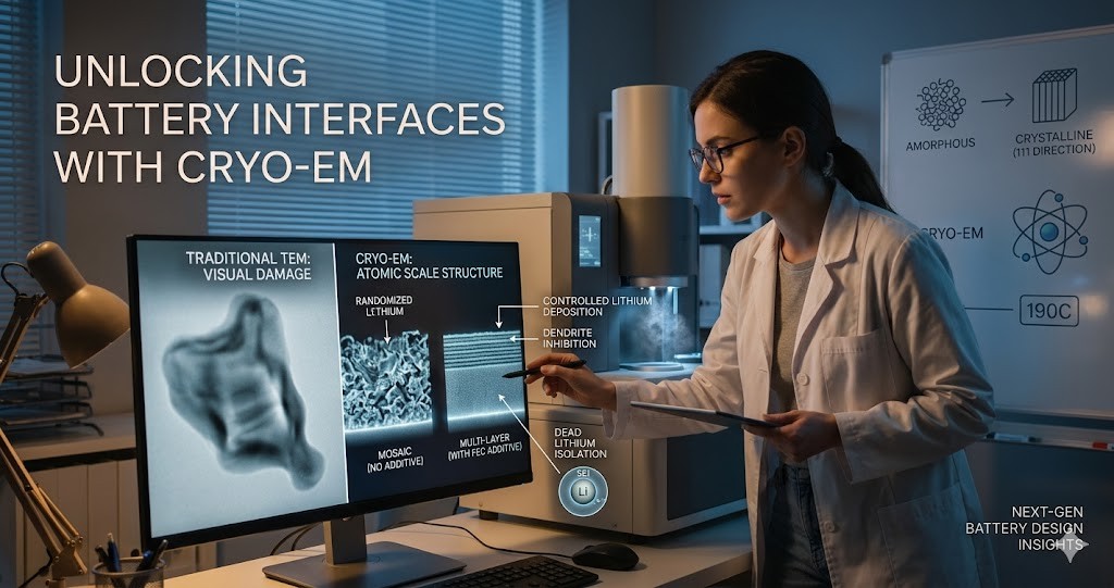 The paper discussed in this document summarizes breakthrough achievements in battery research by repurposing Cryogenic Electron Microscopy (cryo-EM)—a technology that earned the Nobel Prize in Chemistry for its impact on biology. This method has successfully captured the nanostructure of electrode interfaces, previously a “black box,” in their native, pristine state.