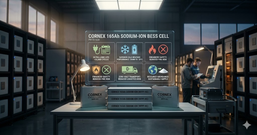 2026年4月7日、中国の電池メーカーCornex New Energy(コーネックス・ニューエナジー)は、定置型エネルギー貯蔵システム(ESS)市場向けに、長寿命を特徴とする165Ahナトリウムイオン角型電池セルを発表しました。リチウムイオン電池(LFP)の代替選択肢として、特に電力網の周波数調整などの高頻度な充放電用途での普及を目指しています。