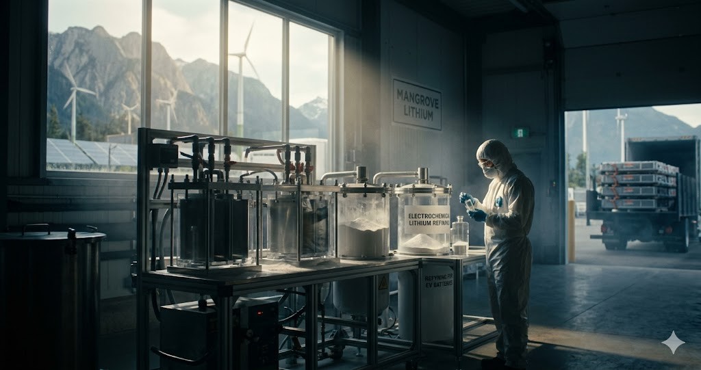 Typically, lithium refining requires large amounts of chemical reagents (such as sulfuric acid and soda ash) and generates significant by-products (such as sodium sulfate). Mangrove Lithium’s electrochemical approach uses electricity directly to remove impurities and refine lithium.