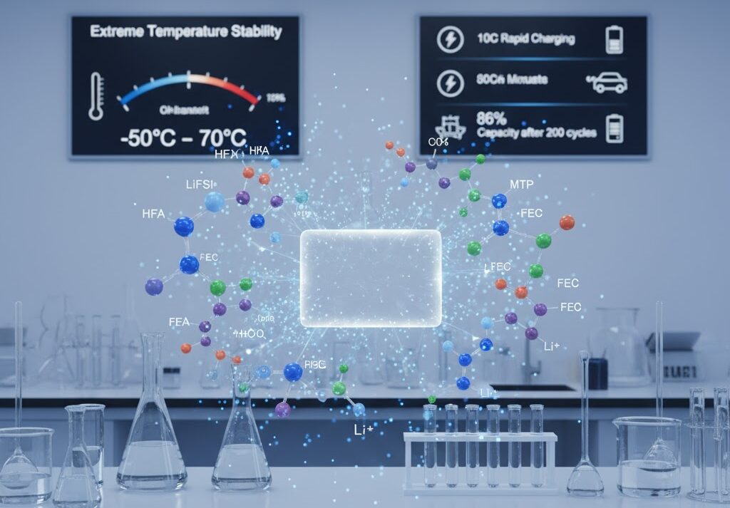 - 熱・界面安定性の確保: HFAやMTFPといったフッ素化成分の導入は、電解質の難燃性を向上させるとともに、リチウム金属負極上に均一で強固なSEI膜(固体電解質界面)の形成を促進します。この安定した界面が副反応を抑制し、熱暴走の開始温度を142度Cまで引き上げ、安全性を大幅に改善しています。