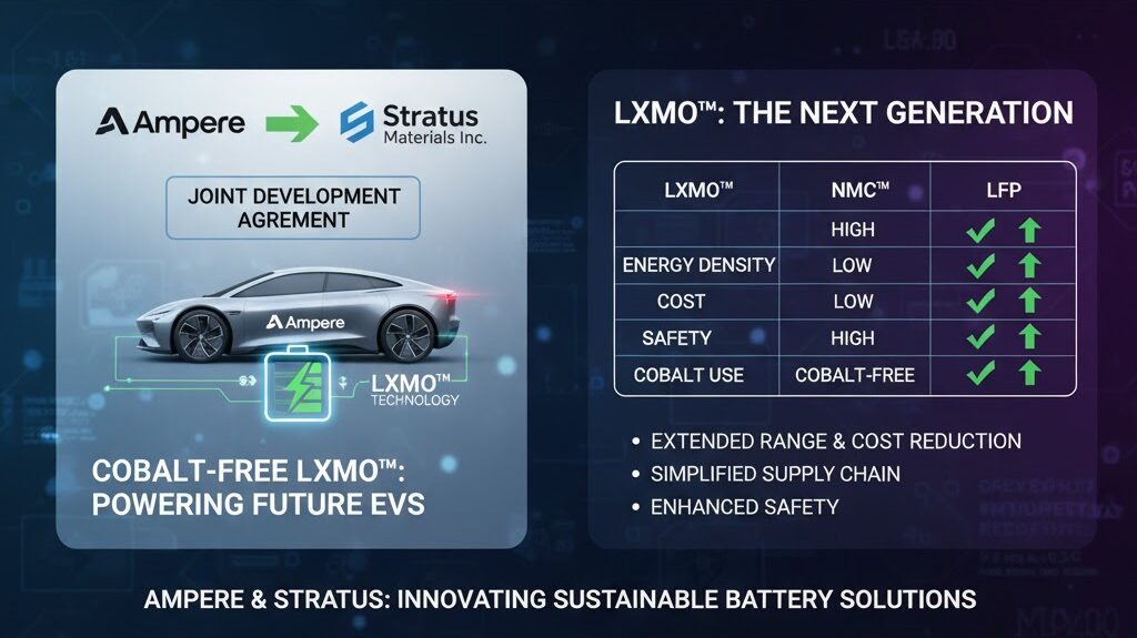 ルノー・グループのEVおよびソフトウェア専業メーカーである**アンペア(Ampere)は、米国の先進リチウムイオン電池向け高エネルギーコバルトフリー正極活物質(CAM)開発企業であるストラタス・マテリアルズ(Stratus Materials Inc.)**と、**共同開発契約(JDA)**を締結しました。