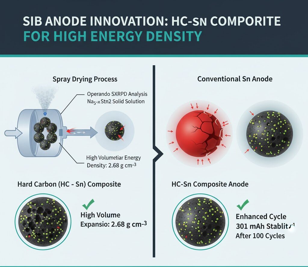 この研究は、ナトリウムイオン電池 (SIB) のアノード(負極)材料として、エネルギー密度、特に体積エネルギー密度の向上を目指し、スプレー乾燥法を用いて硬質炭素 (HC) とスズ (Sn) の複合材料を合成・評価したものです。