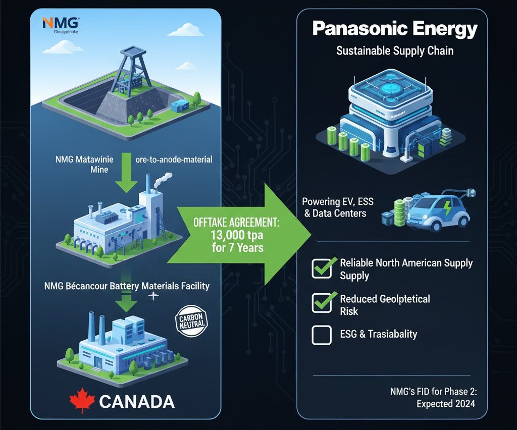 カナダの統合型グラファイト企業であるNouveau Monde Graphite Inc.(NMG)と、パナソニックホールディングスの子会社であるパナソニック エナジー株式会社は、NMGのフェーズ2統合バリューチェーンを通じて生産される**活性陽極材(活物質負極材)**の供給に関する複数年拘束力のあるオフテイク契約を改訂・更新しました。