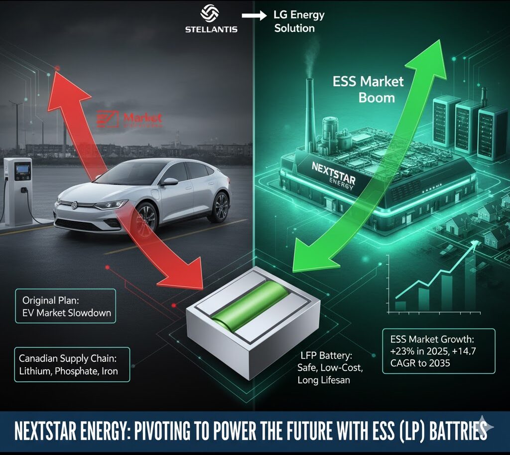 カナダのオンタリオ州ウィンザーにある、ステランティスNVとLGエナジーソリューションの合弁会社であるネクストスター・エナジー社のバッテリー工場が、来月(2025年11月)商業生産を開始しますが、当初の計画であった電気自動車(EV)用ではなく、エネルギー貯蔵システム(ESS)用バッテリーの生産を優先します。