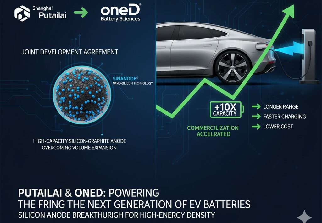 中国の主要なリチウムイオン電池材料サプライヤーであるShanghai Putailai New Energy Technology Co., Ltd. (プタイライ) と、米国のナノシリコン技術企業であるOneD Battery Sciences (OneD) は、リチウムイオン電池向けの次世代シリコングラファイトアノード材料の製品設計を確定し、生産規模を拡大するための**共同開発契約(JDA)**を締結しました。