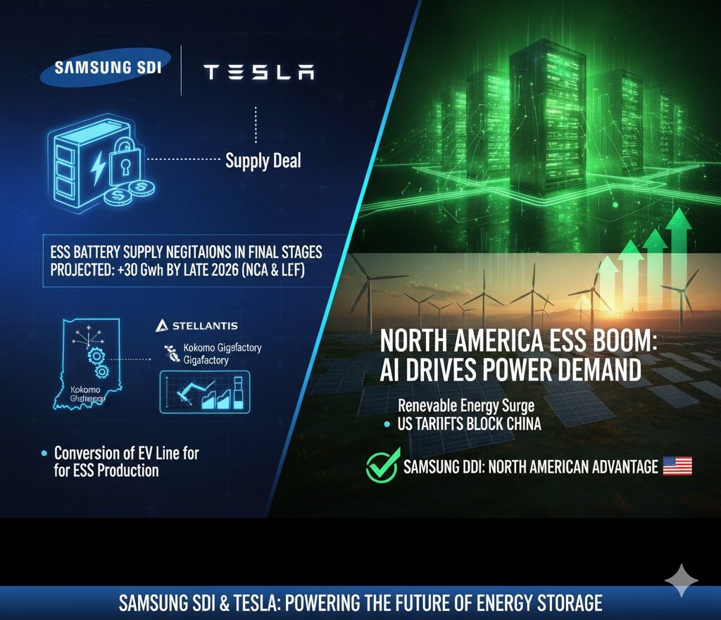 - 協議内容: サムスンSDIは、テスラとの間でESS(エネルギー貯蔵システム)向け電池の納入契約を協議中です。