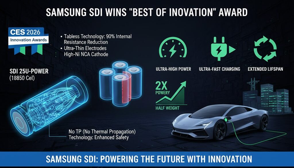 サムスンSDIは、世界最大の電子・IT展示会「CES 2026」(2026年1月6日~9日、ラスベガス開催予定)に先立ち、革新的な技術を持つ製品に贈られる「CESイノベーションアワード」において、高出力円筒形バッテリー「SDI 25U-Power」でベスト・オブ・イノベーション賞を受賞しました。