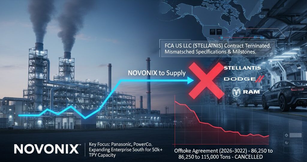 米国テネシー州チャタヌーガに本社を置く大手バッテリー材料・技術企業であるNOVONIX Limited(NASDAQ: NVX、ASX: NVX)は、FCA US LLC(Stellantis NVの子会社)が同社とのバッテリー材料のオフテイク契約を即時解除したことを発表しました。