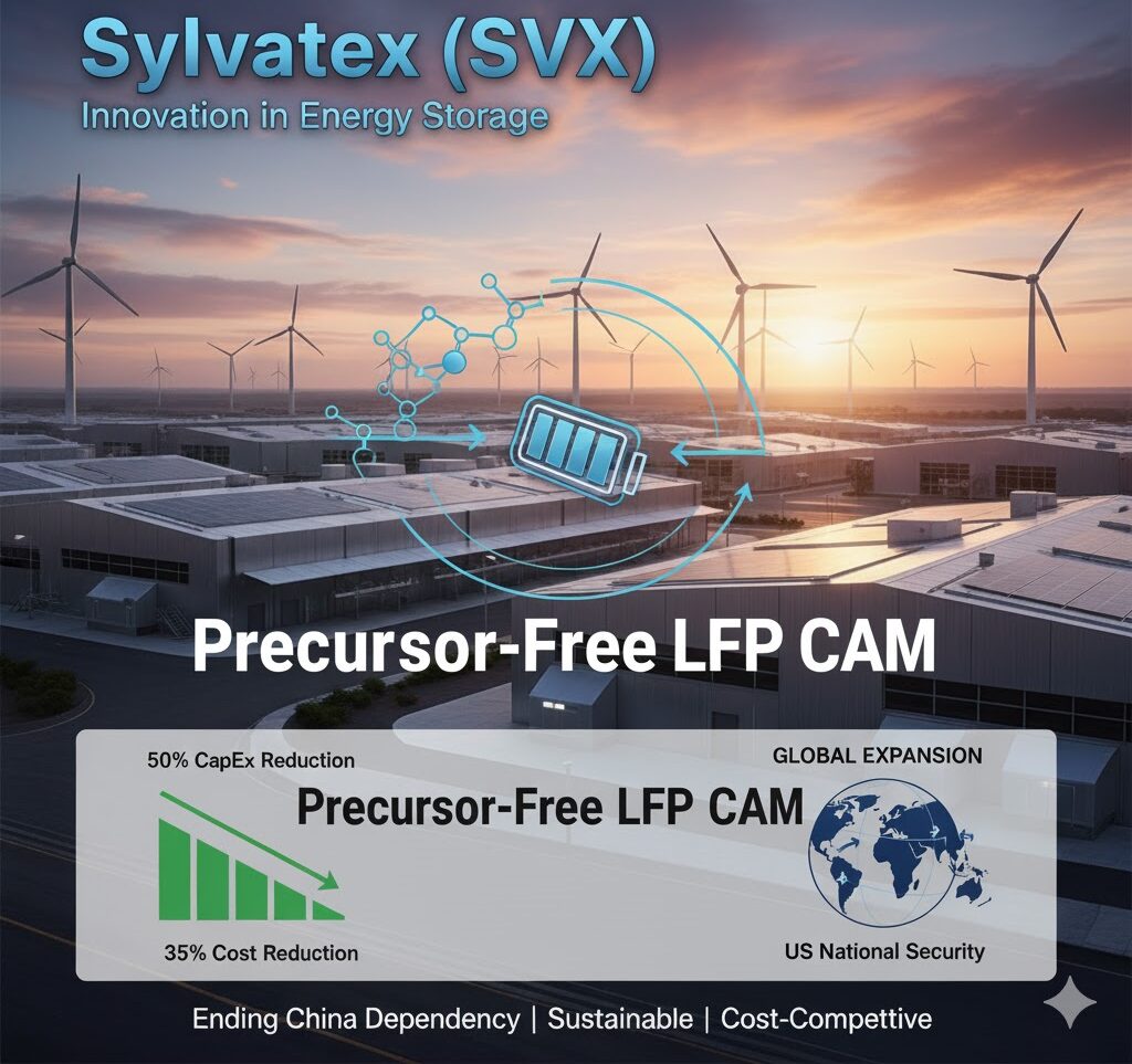 米国の化学会社**Sylvatex(SVX)は、電気自動車(EV)やエネルギー貯蔵システムなどに不可欠なリン酸鉄リチウム(LFP)正極活物質(CAM)**を製造するための、前駆物質(プリカーサー)を使用しない新規プロセスが独立した検証により確認されたと発表しました。この技術は、従来の製造方法と比較して、資本支出(CapEx)を50%以上削減し、総コストを約35%削減できることが証明されました。