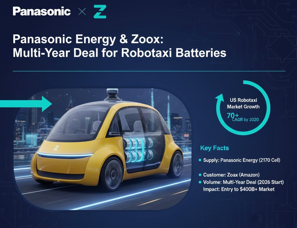 パナソニック エナジー株式会社が、Amazon傘下の自動運転配車サービス企業 Zoox へ円筒形リチウムイオン電池セルを供給する複数年契約を締結したことは、同社にとって 急成長中のロボタクシー市場への画期的な参入 を意味します。