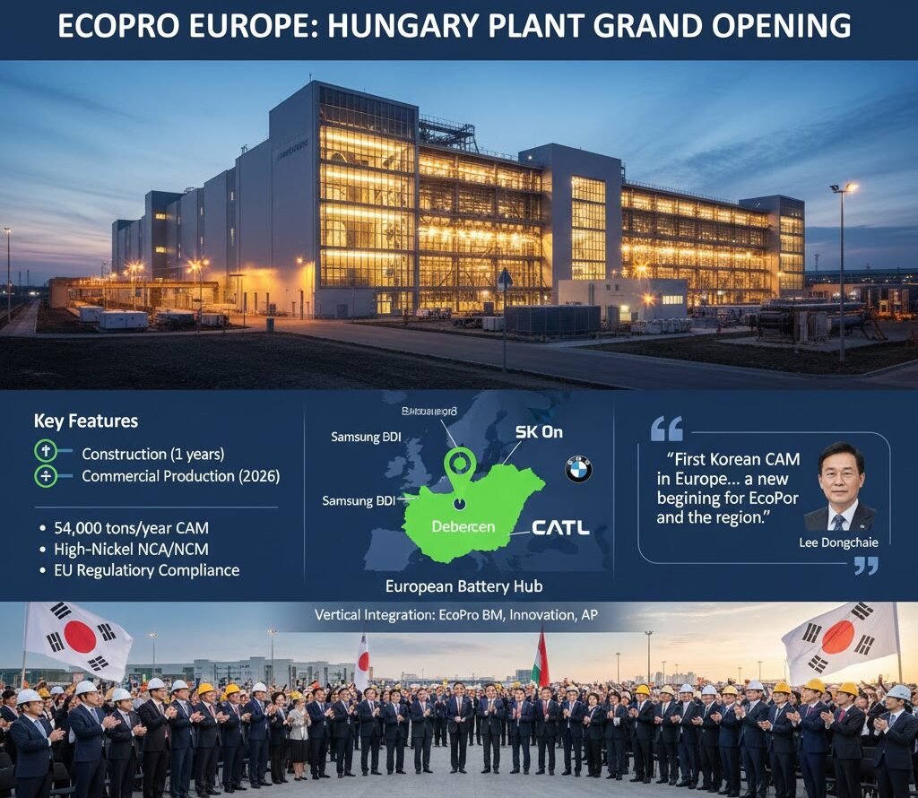 韓国のバッテリー材メーカーであるエコプロ(EcoPro)が、ハンガリーのデブレツェン(Debrecen)に正極材工場を完成させ、商業生産を開始しました。これは、韓国のバッテリー素材企業としては初めての欧州生産拠点となります。