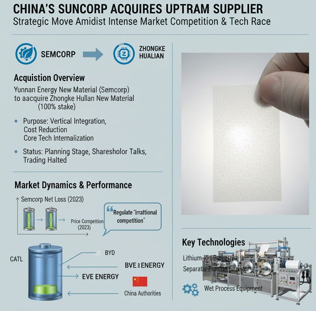 中国のリチウムイオン電池セパレーター最大手である**雲南能源新材料(Yunnan Energy New Material、通称セムコープ / Semcorp)は、激化する市場競争とそれに伴う業績への圧力を乗り切るため、上流設備サプライヤーの中科花聯新材料(Zhongke Hualian New Material)**を買収する計画を発表しました。