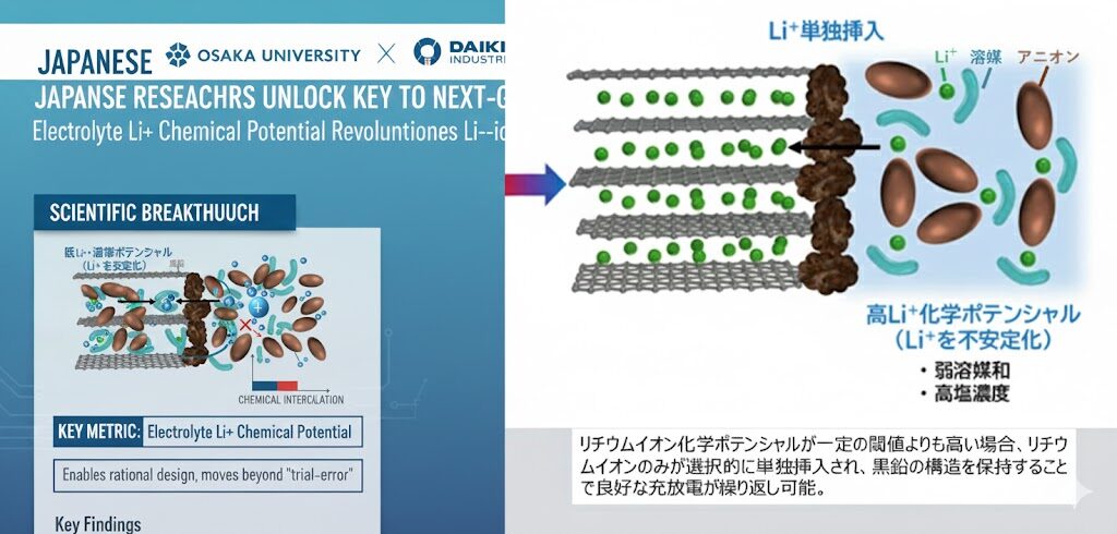 | 決定因子の発見 | **「電解液中のリチウムイオン化学ポテンシャル」**が、黒鉛負極の充放電反応(リチウムイオン単独挿入)の可否を示す定量的な指標であることを発見。 | |