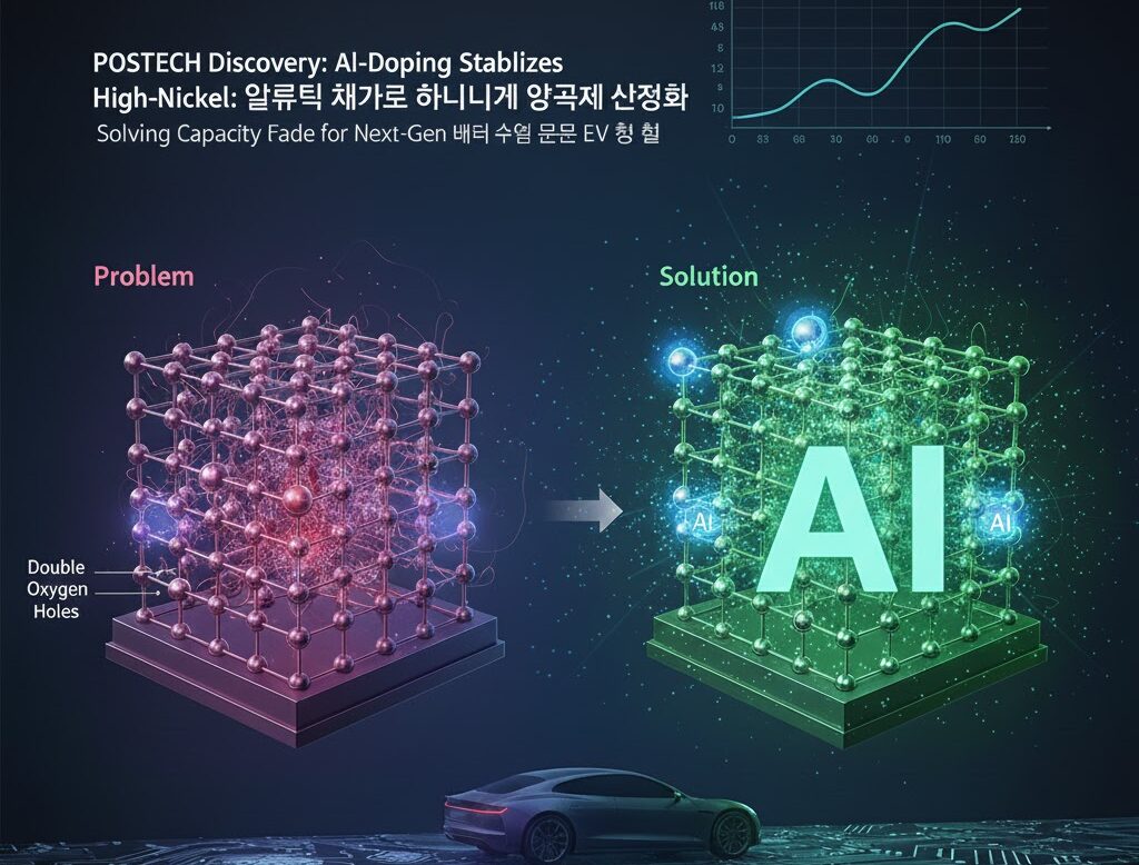 浦項工科大学(POSTECH)の研究チームは、電気自動車(EV)の航続距離を延ばすために不可欠な高ニッケル正極が抱える深刻な課題、すなわち充放電サイクルにおける急激な容量低下の根本原因を特定し、その解決策として少量のアルミニウム(Al)添加が極めて有効であることを発見しました。