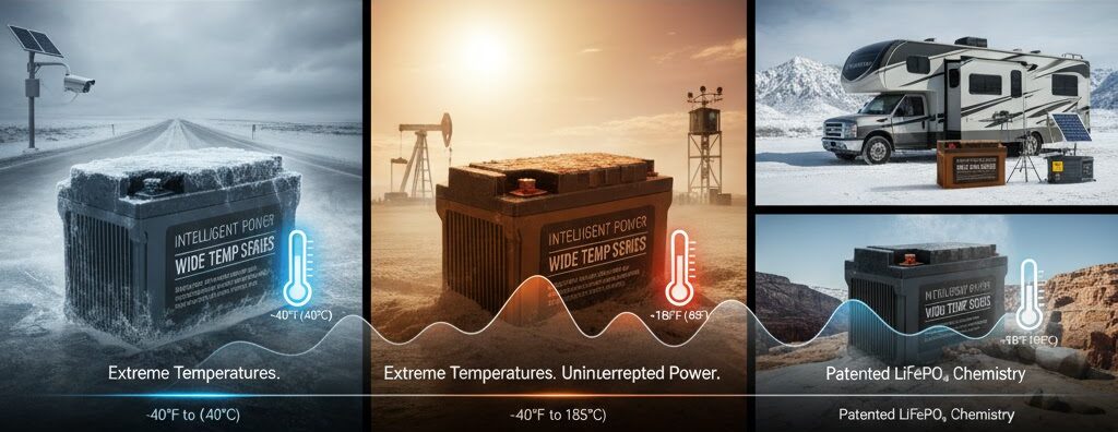 ユタ州リンドン—インテリジェントパワー社は、過酷な屋外環境向けに設計された最先端のリン酸鉄リチウム(LiFePO₄)バッテリー**「Wide Tempシリーズ」の発売を発表しました。このバッテリーは、外部ヒーターや複雑な熱管理システムを一切必要とせず、-40°Fから185°F(-40°Cから+85°C)**という極めて広い温度範囲で信頼性の高い電力供給を可能にする、画期的な製品です。