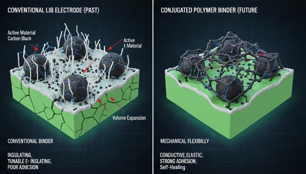共役ポリマーバインダーは、電子伝導性、イオン輸送、機械的堅牢性を単一の多機能コンポーネントとして提供することで、「デッドウェイト」である絶縁バインダーと導電添加剤の両方を置き換える可能性を秘めています。