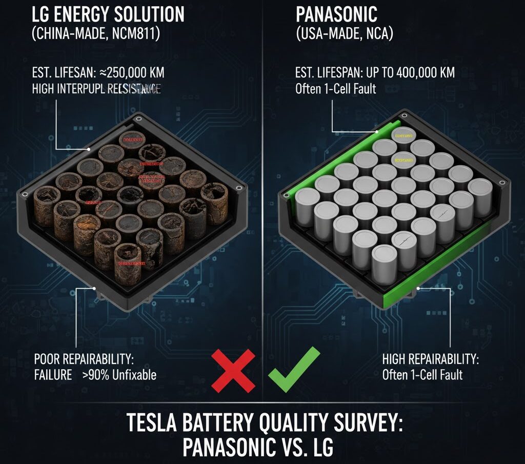 - 高い故障率と短い寿命: LG製バッテリーパックは、パナソニック製に比べて寿命が著しく短いことが実証データで示されています。