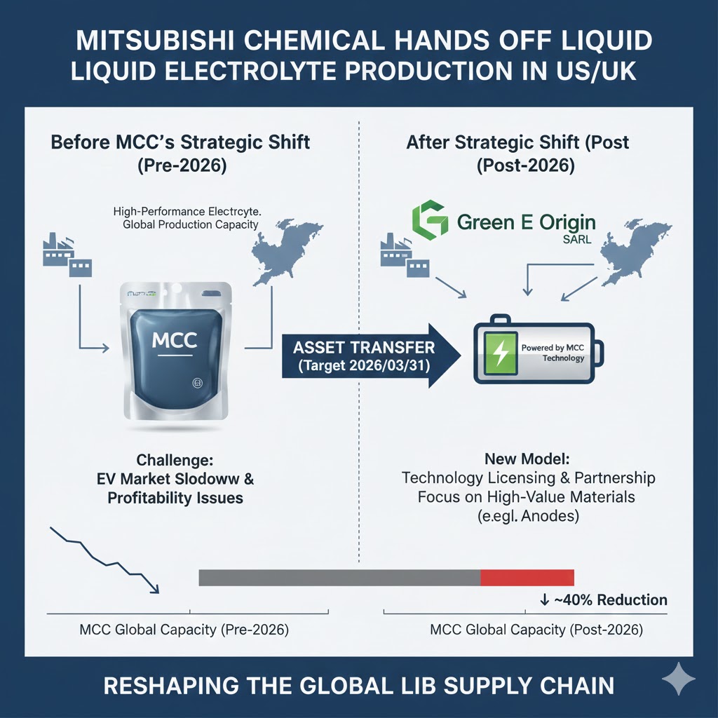 今回の事業譲渡は、EV市場の成長鈍化に伴う採算悪化と、同社グループが進める化学事業の構造改革の一環。MCCは自社での設備投資を伴う生産体制を縮小し、今後は技術供与やライセンス提供を強化する戦略へと転換する。これにより、同グループの電解液のグローバル生産能力は約4割減少する見通しだ。