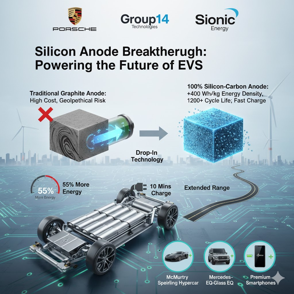 ポルシェが出資するGroup14 Technologiesとニューヨークを拠点とするSionic Energyは、共同研究の結果、リチウムイオンバッテリーの主要構成要素であるシリコンアノード(負極)において画期的な概念実証を達成したと発表しました。この進歩は、電気自動車(EV)の航続距離を延ばし、充電時間を短縮し、製造コストと地政学的リスクを低減する可能性を秘めています。