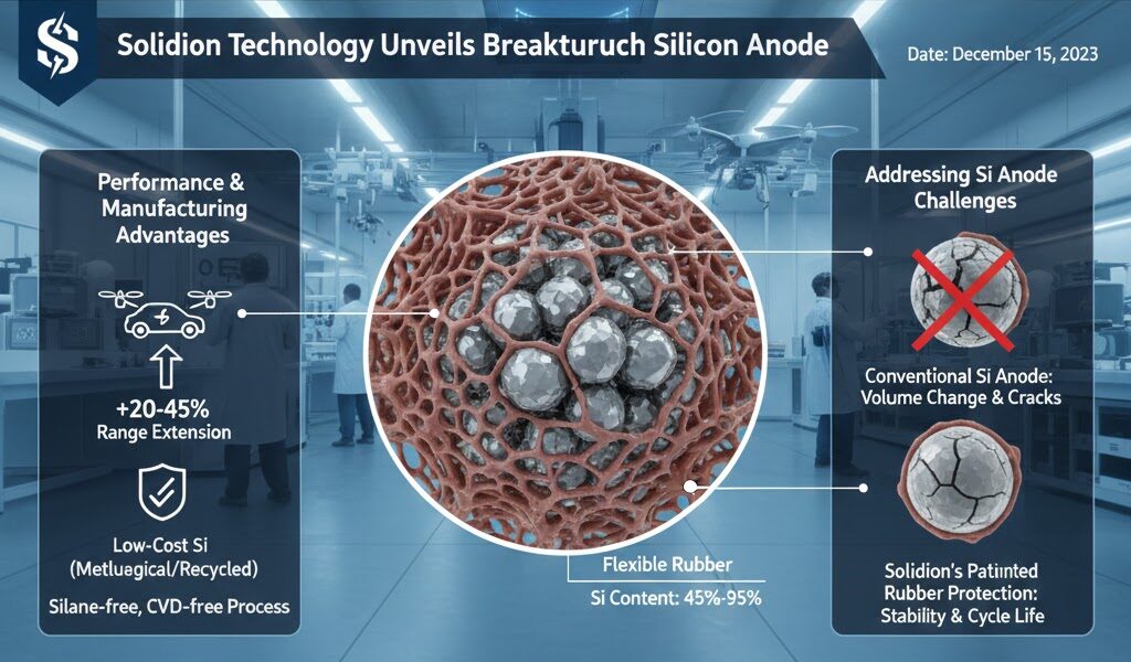 Solidionが開発したこの Siリッチアノード材料は、従来のバッテリー技術が抱えていたシリコンの課題(充放電サイクルにおける体積変化による劣化)を克服し、実用性と経済性を両立させます。
