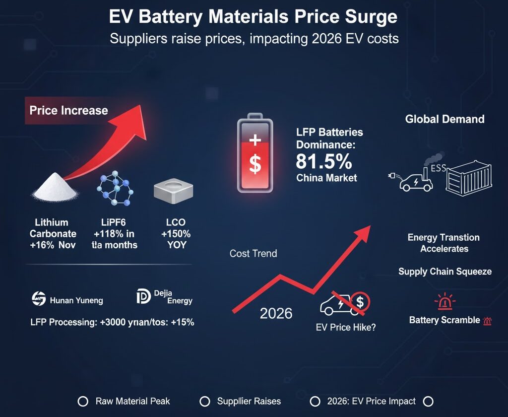 中国の主要な電池材料サプライヤー各社は、原材料コストの急騰と世界的な需要増を受け、相次いで製品価格の引き上げを発表しました。これは過去数年続いたEV用電池の価格下落傾向が反転する可能性を示唆しており、2026年には電気自動車(EV)本体の価格に影響が及ぶと予想されています。