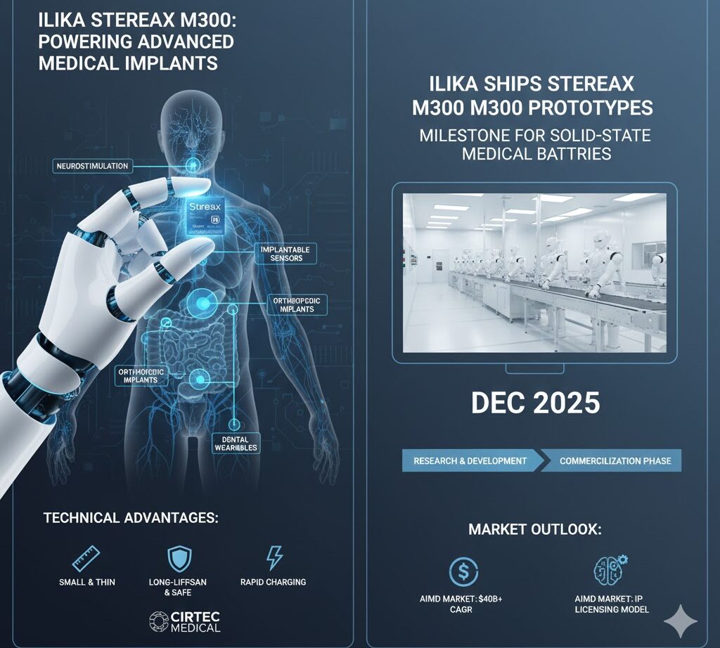英国の全固体電池(Solid-state battery)の先駆者である Ilika(イリカ)社 は、2025年12月18日、小型全固体電池 Stereax M300 のプロトタイプを主要顧客に向けて出荷開始したと発表しました。これは、同社が研究開発段階から商業化フェーズへと移行する重要な節目(マイルストーン)となります。