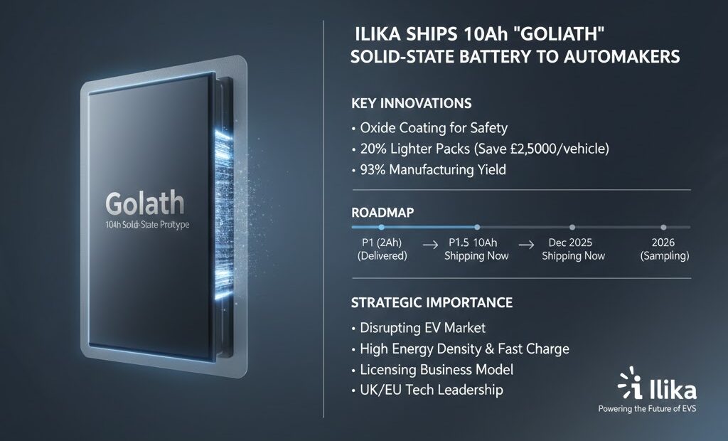 Ilika社は、電気自動車(EV)市場の変革を狙う**大型全固体電池「Goliath(ゴリアス)」**の10Ahプロトタイプを、自動車メーカーを含む主要顧客へ出荷開始しました。