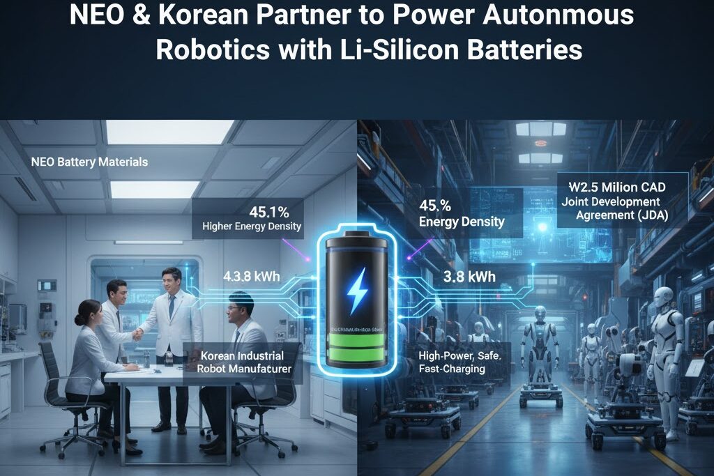 リチウムシリコン電池の開発企業であるNEO Battery Materials Ltd.(NEO)は、自律型産業用ロボットメーカーである韓国の顧客と、約250万カナダドル(約25億ウォン)の購入注文契約と**共同開発契約(JDA)**を締結したと発表しました。