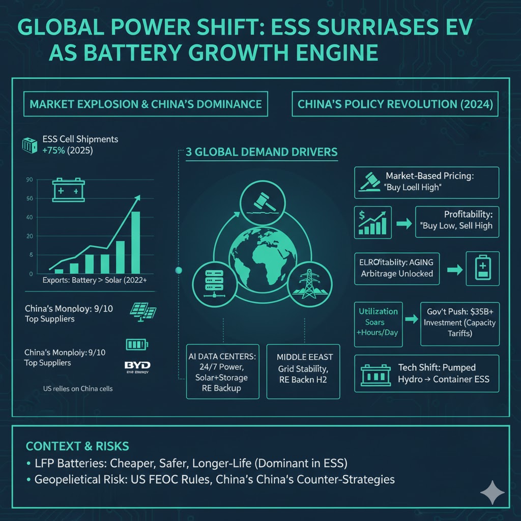 現在、世界のエネルギー市場では「電気自動車(EV)」に代わり、**「エネルギー貯蔵システム(ESS)」**がバッテリー産業の強力な成長エンジンとなっています。背景には、中国国内の制度改革と、世界的なAIデータセンターの爆発的増加があります。