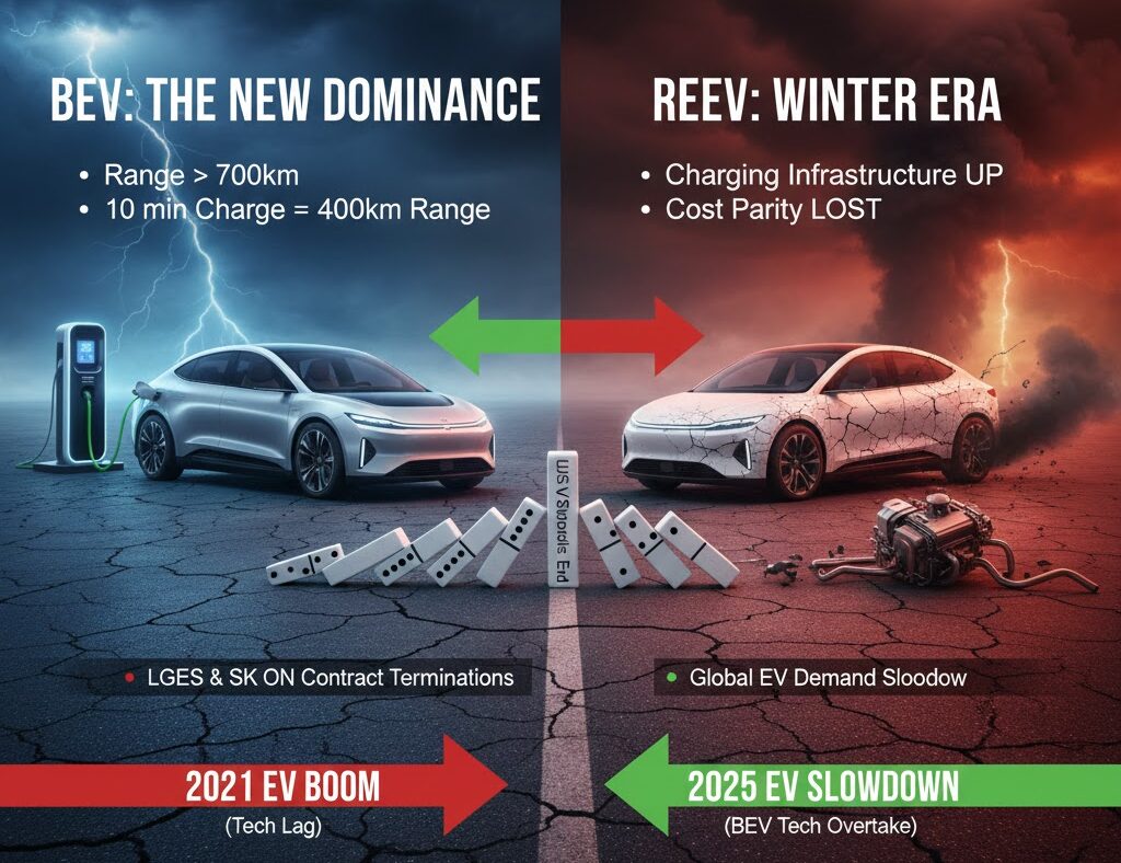 かつて航続距離への不安(レンジ・アンキシャリティ)を解消する「最適解」として爆発的に普及したレンジエクステンダー式電気自動車(REEV)が、大きな転換点を迎えています。2025年後半、中国市場ではREEVの販売が5か月連続で減少する一方、技術革新を背景とした純電気自動車(BEV)への回帰が鮮明になっています。