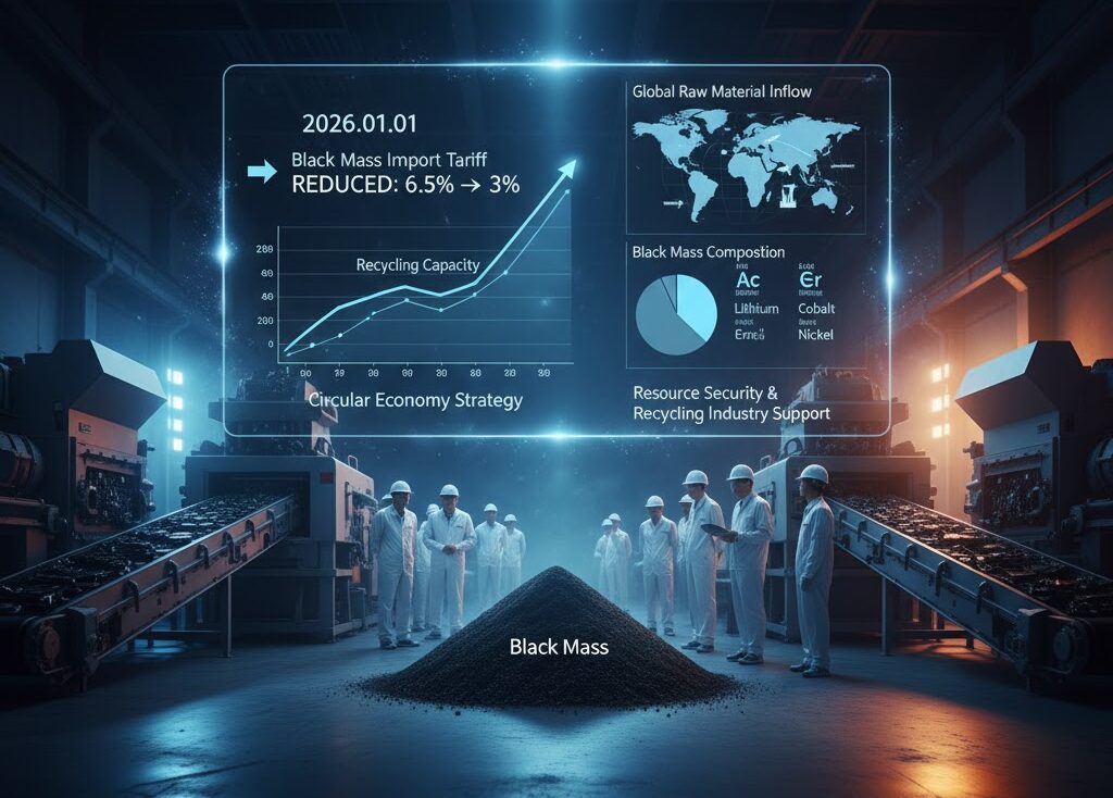 中国政府は2026年1月1日付で、リチウムイオン電池のスクラップから成る「ブラックマス(Black Mass)」の輸入関税を従来の 6.5% から 3% へと大幅に引き下げました。