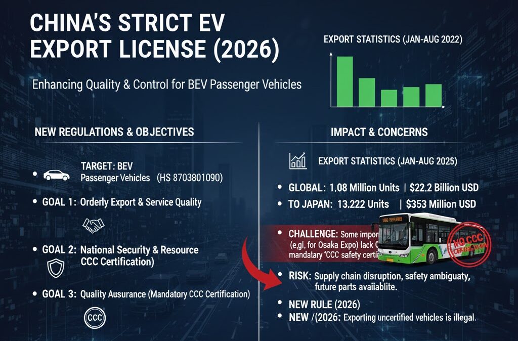 中国政府(商務部、工業情報化部、海関総署、市場監管総署)は、2026年1月1日より、純電気自動車(BEV)の乗用車を対象に厳格な「輸出許可管理(輸出ライセンス制度)」を導入しました。