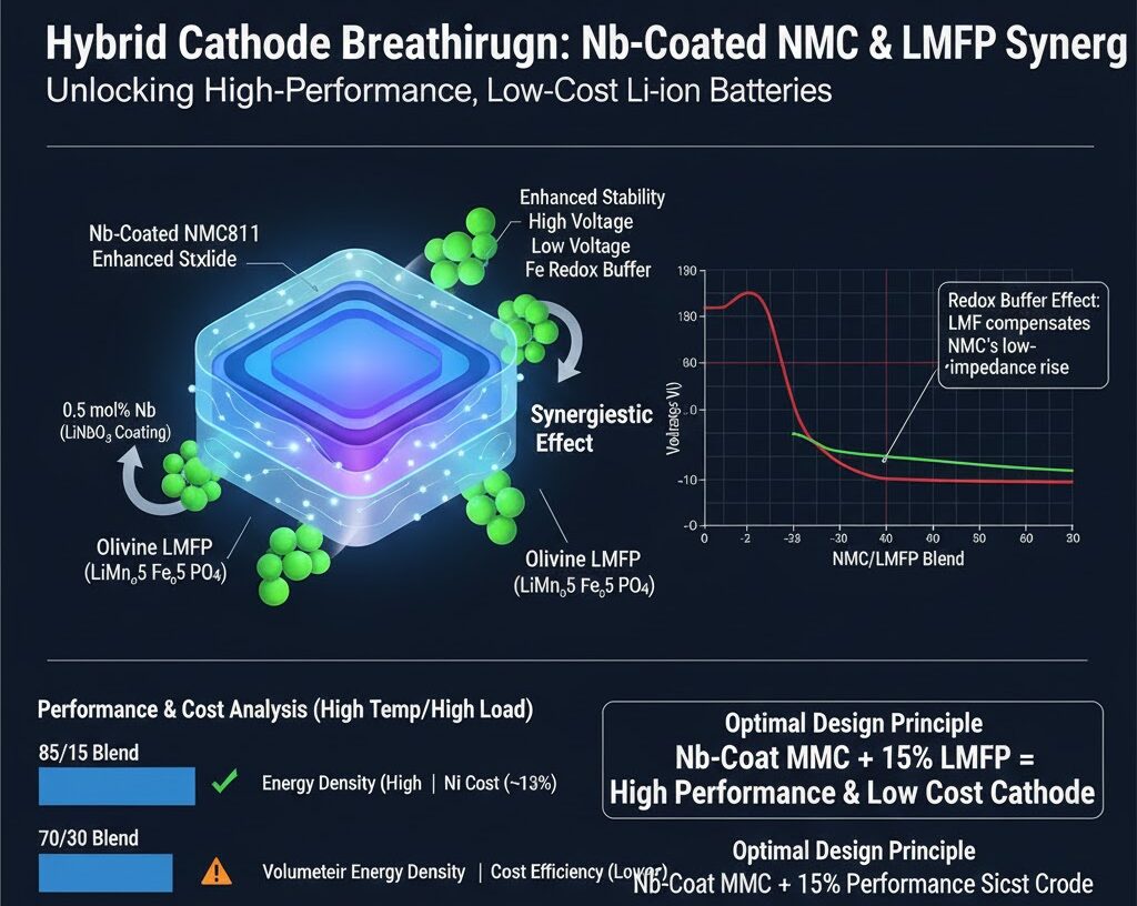 本研究は、高ニッケル層状酸化物(NMC811)にNb(ニオブ)コーティングを施したものと、オリビン材料(LMFP)を組み合わせた混合正極について、その相乗効果と最適な運用条件を解明しました。