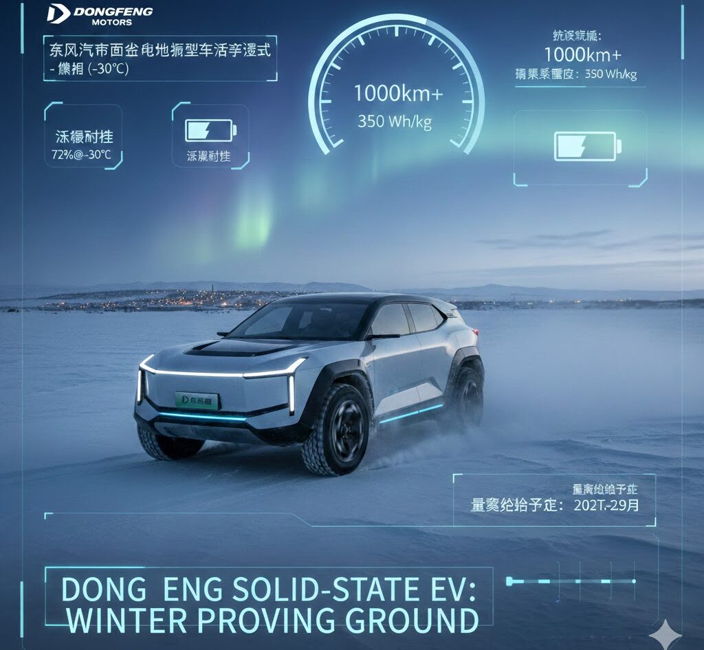 中国の東風汽車はエネルギー密度 350 Wh/kg の固体電池を搭載した試作車両(プロトタイプ)を公開し、中国最北端の黒竜江省・漠河(モーハ)での冬季試験に向けて出発させました。これは同社が掲げる「2026年9月の量産開始」に向けた、最終段階の検証プロセスです。