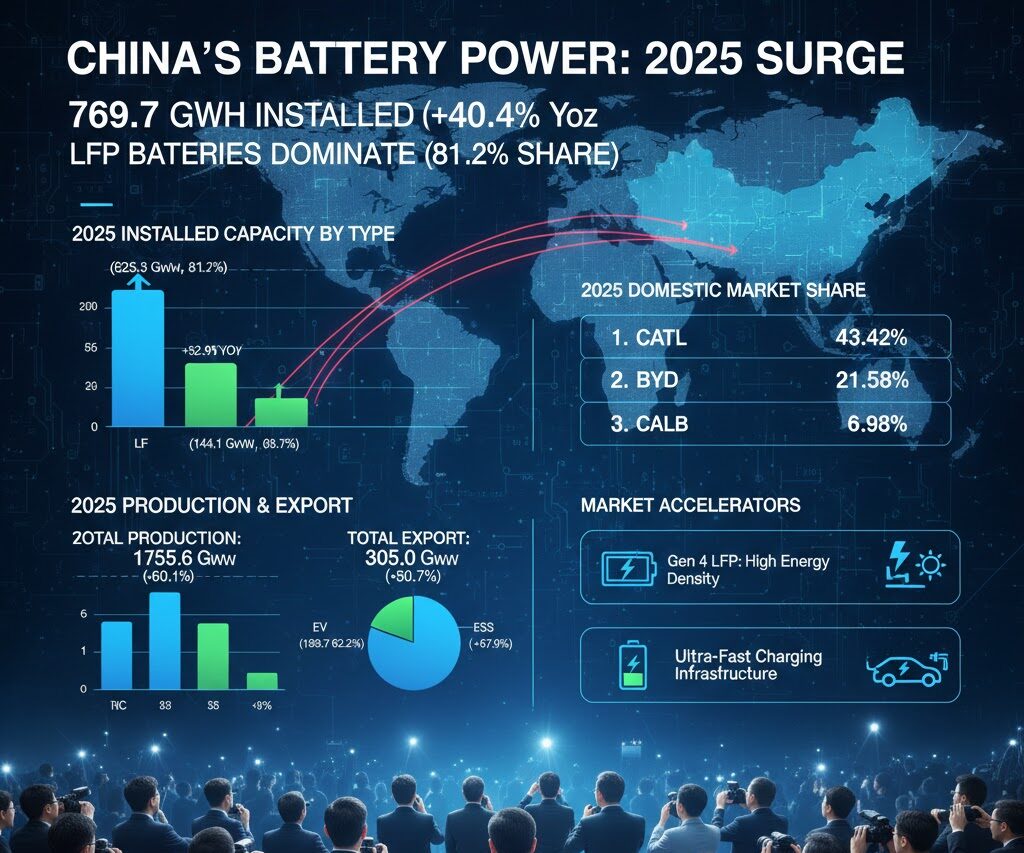 中国自動車電池イノベーション連盟(CABIA)のデータによると、2025年の中国国内における動力用バッテリー設置量は前年比40.4%増の769.7GWhに達しました。特にLFP(リン酸鉄リチウム)電池の躍進が顕著です。